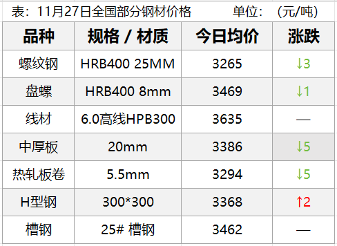 11月27日,钢材现货市场以跌为主,期货市场主要品种主力涨跌不一,其中螺纹跌0.13%、热卷跌0.27%、铁矿涨0.44%,焦炭涨0.03%,焦煤跌0.19%。本周五大钢材品种库存继续环降,创3个半月低位,而产量环比增加,表观需求微降,仍于去年同期,目前进入淡季并且钢厂盈利情况仍在持续走弱,明日钢价......