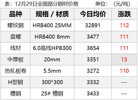 12月29日,钢材现货市场以涨为主,期货市场主要品种主力涨跌不一,其中螺纹、热卷涨1%左右,铁矿涨2.58%,焦煤跌1.27%,焦炭跌1.58%。全国财政会议召开,指出2026年继续实施更加积极的财政政策,提振了市场信息, 钢价跟随期钢同步走强,钢材消费淡季,明日钢价......
