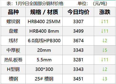 1月9日,钢材现货市场小幅下跌,期货市场主要品种主力全部下跌,其中螺纹跌1.1%、热卷跌1.02%,铁矿跌0.73%,焦煤跌0.71%,焦炭跌1.83%。双焦冲高回落,叠加本周五大钢材品种库存由降转增,市场情绪回落,成材品种昨夜盘延续下行,今日内维持窄幅震荡运行,期货价格重心继续小幅下移,下周钢价......