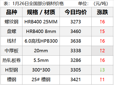 1月26日,钢材现货市场以涨为主,期货市场主要品种主力以涨为主,其中螺纹、热卷涨0.3%左右,铁矿跌0.95%,焦炭涨0.44%,焦煤涨1.35%。春节前夕钢厂加大检修力度对钢价形成压制,叠加当前终端需求走弱,库存高企,期螺冲高受阻,明日钢价......