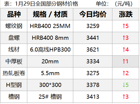 1月29日,钢材现货市场小幅上涨,期货市场主要品种主力全部上涨,其中螺纹涨1.12%、热卷涨0.79%,铁矿涨1.78%,双焦涨4%左右。今日,商品市场情绪走强,贵金属、有色板块大涨,能源品强势,双焦大涨近4%,且焦炭现货首轮提涨落地均对当前市场有所提振,明日钢价......