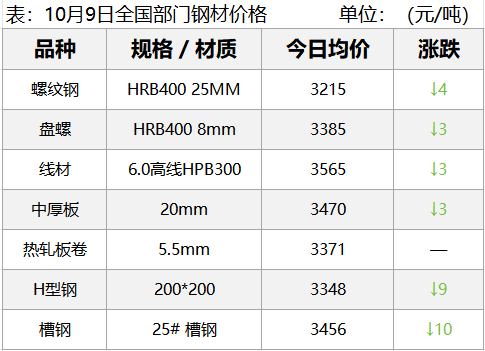10月9日,钢材现货市场小幅下跌,期货市场主要品种主力全部上涨,其中螺纹、热卷、铁矿石涨跌1%左右,焦炭涨0.52%,焦煤涨1.57%。商务部决定对稀土相关技术等物项实施出口管制,蒙煤国庆期间闭关7天(10.1-10.7),10月8日已恢复正常通关,焦炭首轮提涨落地,明日钢价......