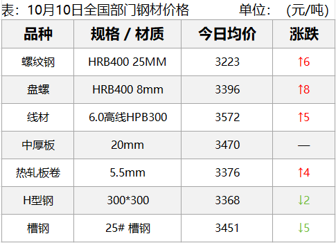 10月10日,钢材现货市场小幅上涨,期货市场主要品种主力全部上涨,其中螺纹、热卷、铁矿涨1%左右,焦炭涨1.86%,焦煤涨1.22%。两部门治理价格无序竞争,双焦盘面整体延续反弹趋势,节后工地加速采购,需求回升明显,现货价格调涨,明日钢价......