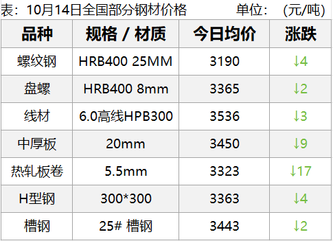 10月14日,钢材现货市场小幅下跌,期货市场主要品种主力涨跌不一,其中螺纹、热卷跌1%左右,铁矿跌2%左右,双焦涨1%左右。中方对美船舶收取特别港务费今起正式施行,贸易摩擦升温,对市场情绪有一定影响,受需求疲软和库存累积影响,钢价延续弱势震荡,但焦煤、焦碳的上涨反映部分品种成本支撑较强,明日钢价......