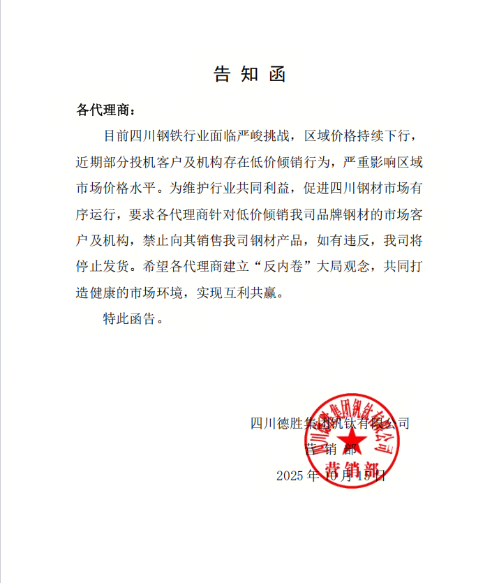 目前四川钢铁行业面临严峻挑战,区域价格持续下行,近期部分投机客户及机构存在低价倾销行为,严重影响区域市场价格水平。为维护行业共同利益,促进四川钢材市场有序运行,四川钢厂发布资源管控措施。目前看,四川钢铁行业“反内卷”政策持续推行,有利于提振市场信心,利好钢材价格走势。