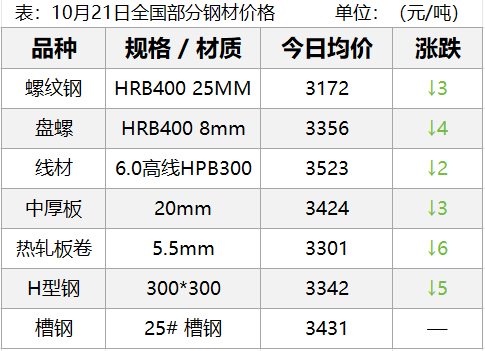 10月21日,钢材现货市场小幅下跌,期货市场主要品种主力以跌为主,其中螺纹、热卷跌0.3%左右、铁矿涨0.13%左右,双焦跌3%左右。钢材需求疲软与政策预期博弈,市场情绪谨慎——铁水产量高位支撑原料需求,但房地产投资开工销售全面走弱及钢厂限产预期压制成材价格,明日钢价......