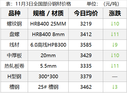 11月3日,钢材现货市场小幅下跌,期货市场主要品种主力全部下跌,其中螺纹、热卷涨跌1%左右,铁矿跌2%左右,焦炭跌1.2%左右,焦煤跌1%左右。河北、天津今日启动重污染天气预警,铁矿石国内到港猛增,创近年来最高值,钢铁反内卷持续推进,明日钢价......