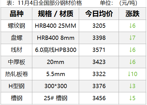 11月4日,钢材现货市场小幅下跌,期货市场主要品种主力全部下跌,其中螺纹、热卷跌超1%左右,铁矿跌超1.7%,双焦跌2.5%左右。今日河南多地启动重污染天气橙色预警,焦炭第三轮提涨预计在11月5日零点正式执行,对钢价有一定的支撑,明日钢价......