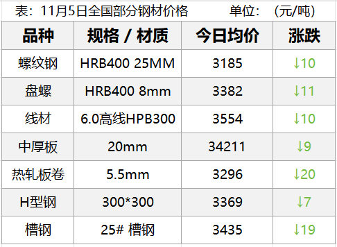 11月5日,钢材现货市场小幅下跌,期货市场主要品种主力全部下跌,其中螺纹跌1.2%、热卷、铁矿跌1%左右,双焦跌0.5%左右。11月传统旺季临近尾声,下游施工进度放缓,河南、山西、河北启动重污染预警,对钢价有一定的影响,明日钢价......