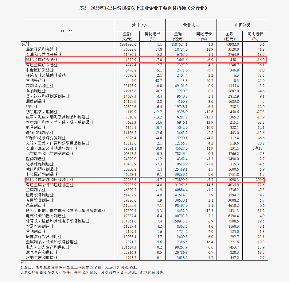 黑色金属冶炼和压延加工业2025年利润总额1098.3亿元