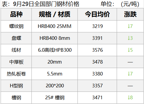 9月29日,钢材现货市场小幅下跌,期货市场主要品种主力全部下跌,其中螺纹、热卷、铁矿石跌超1%左右,双焦跌超4%左右。唐山钢厂实施生产调控,现货市场成交氛围偏弱,普方坯价格持稳但下游需求疲软,建筑钢材库存环比下降,明日钢价......
