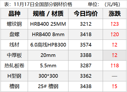 11月17日,钢材现货市场以涨为主,期货市场主要品种主力全部上涨,其中螺纹涨1.64%、热卷涨1.57%,铁矿涨1.81%,焦炭涨1.76%,焦煤涨0.75%。